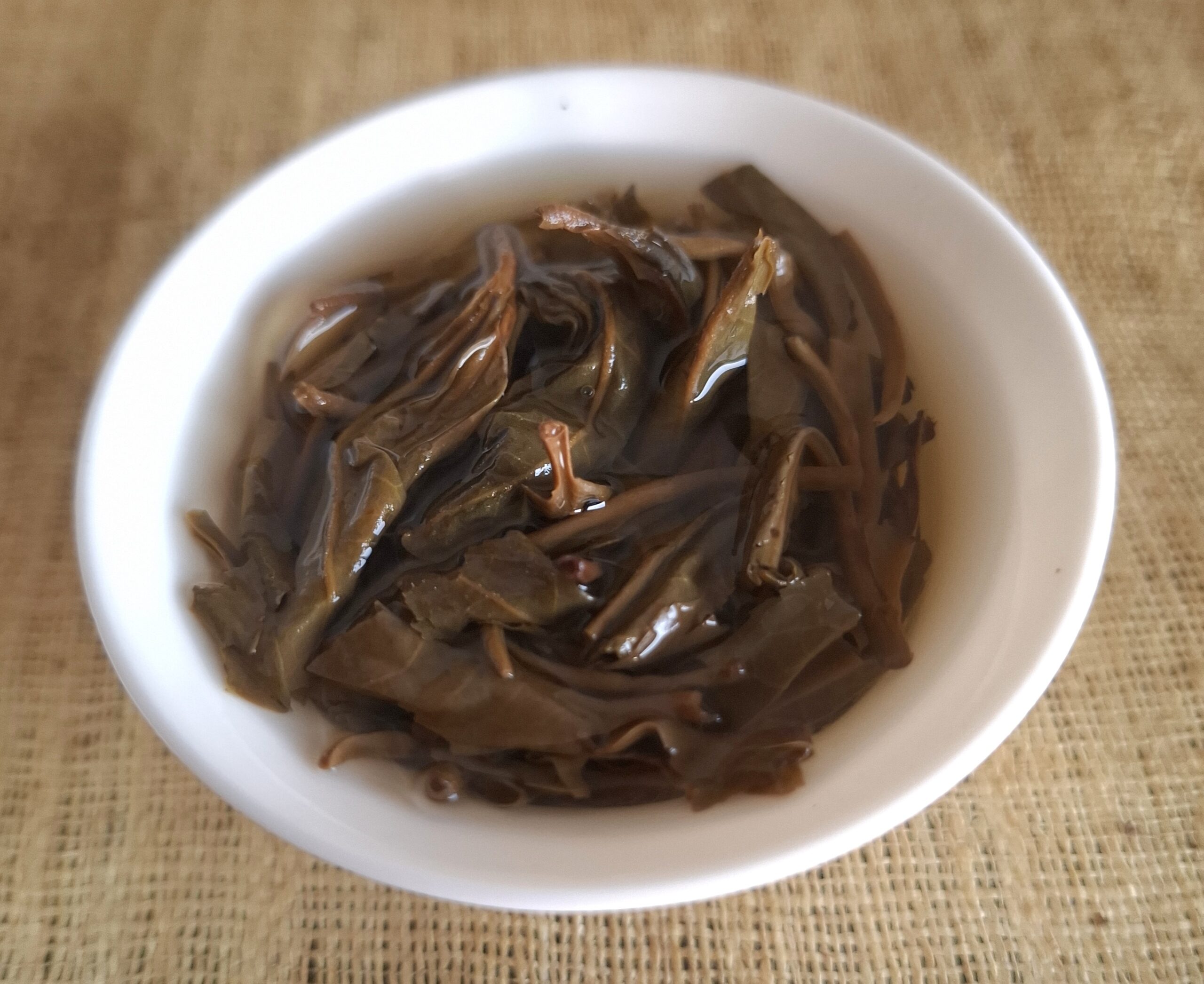 At ten years the tea now has a leather-woody fragrance with some floral notes. The tang gan is smooth and oily but with some granular texture. It still has some obvious astringency and bitterness, but it's still a balanced tea. It has some sheng jin and some nice hou yun with some floral-fruity fragrance and a little cooling.